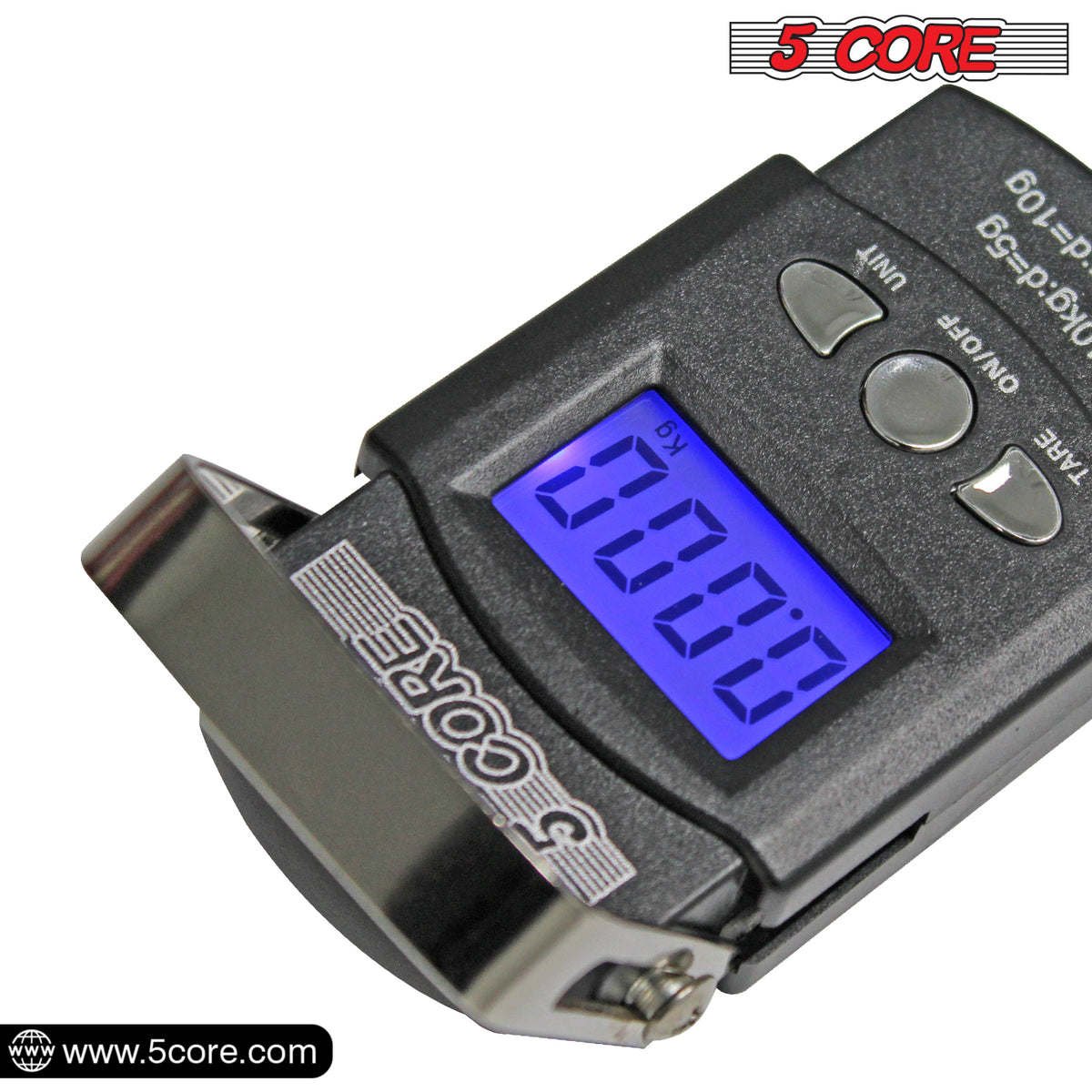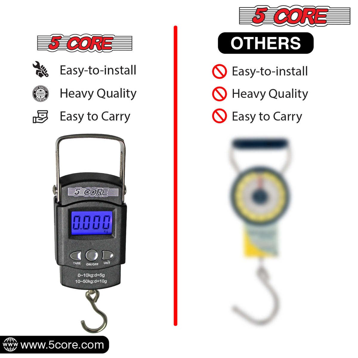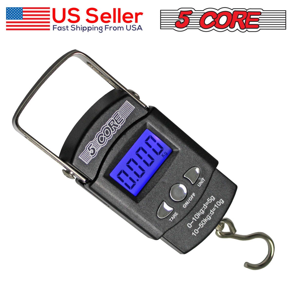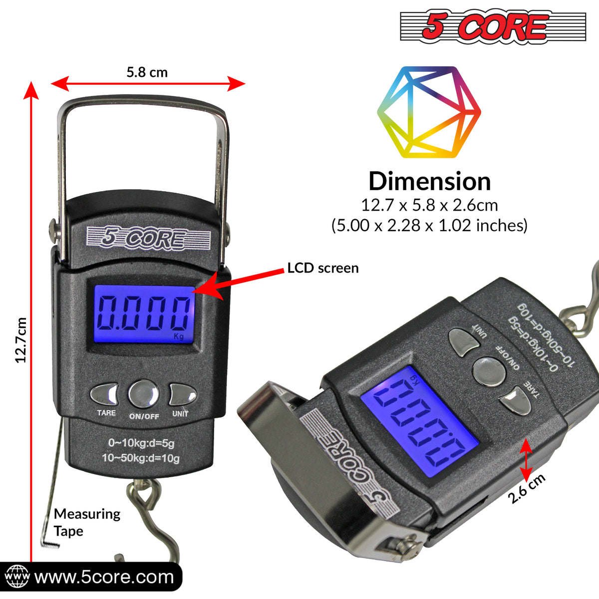 5 Core Fish Scale 110lb/50kg Capacity Backlit Blue LCD Display Fishing Scale with Built-in Measuring Tape, Hanging Hook Scale Operates with 2 AAA Batteries- LS-006
