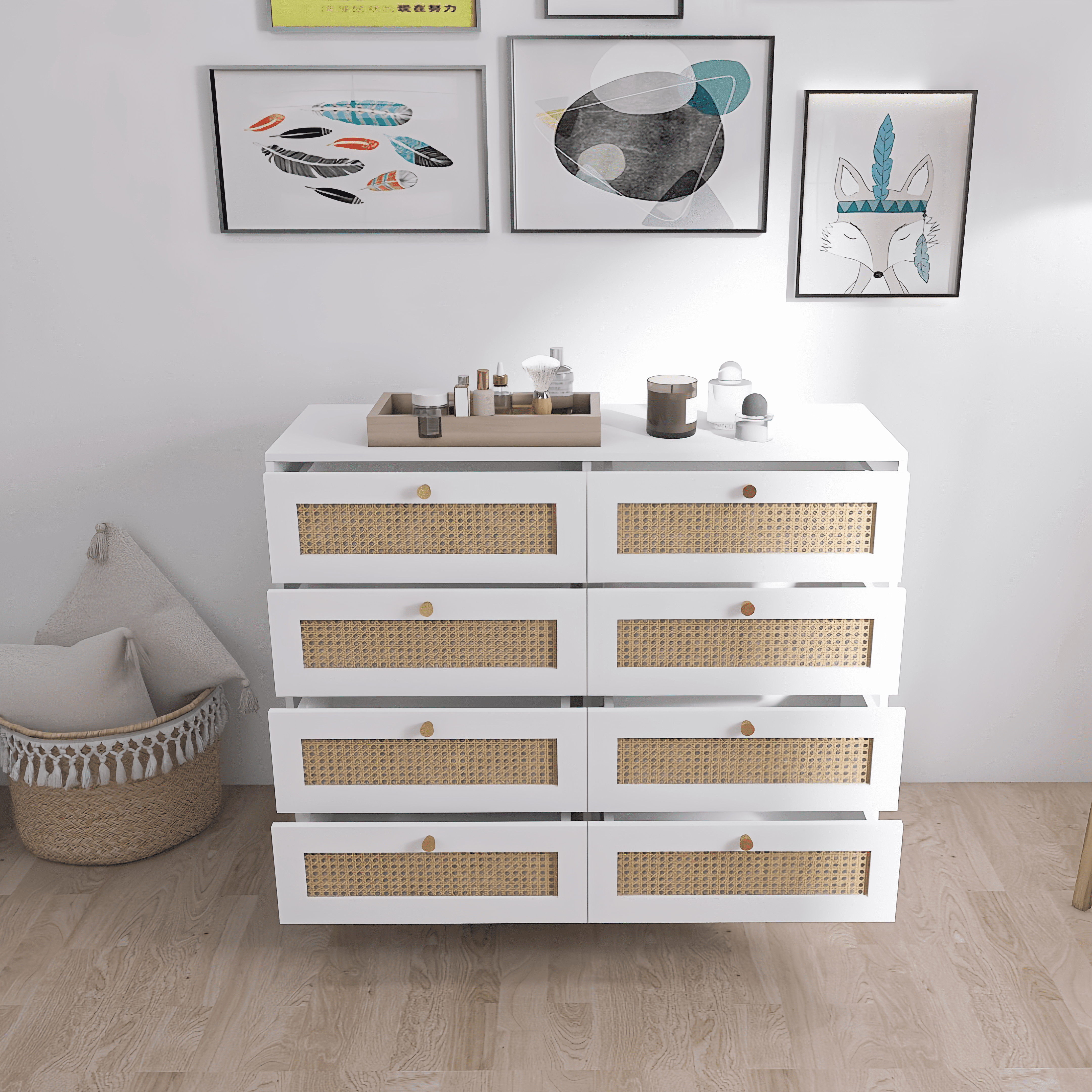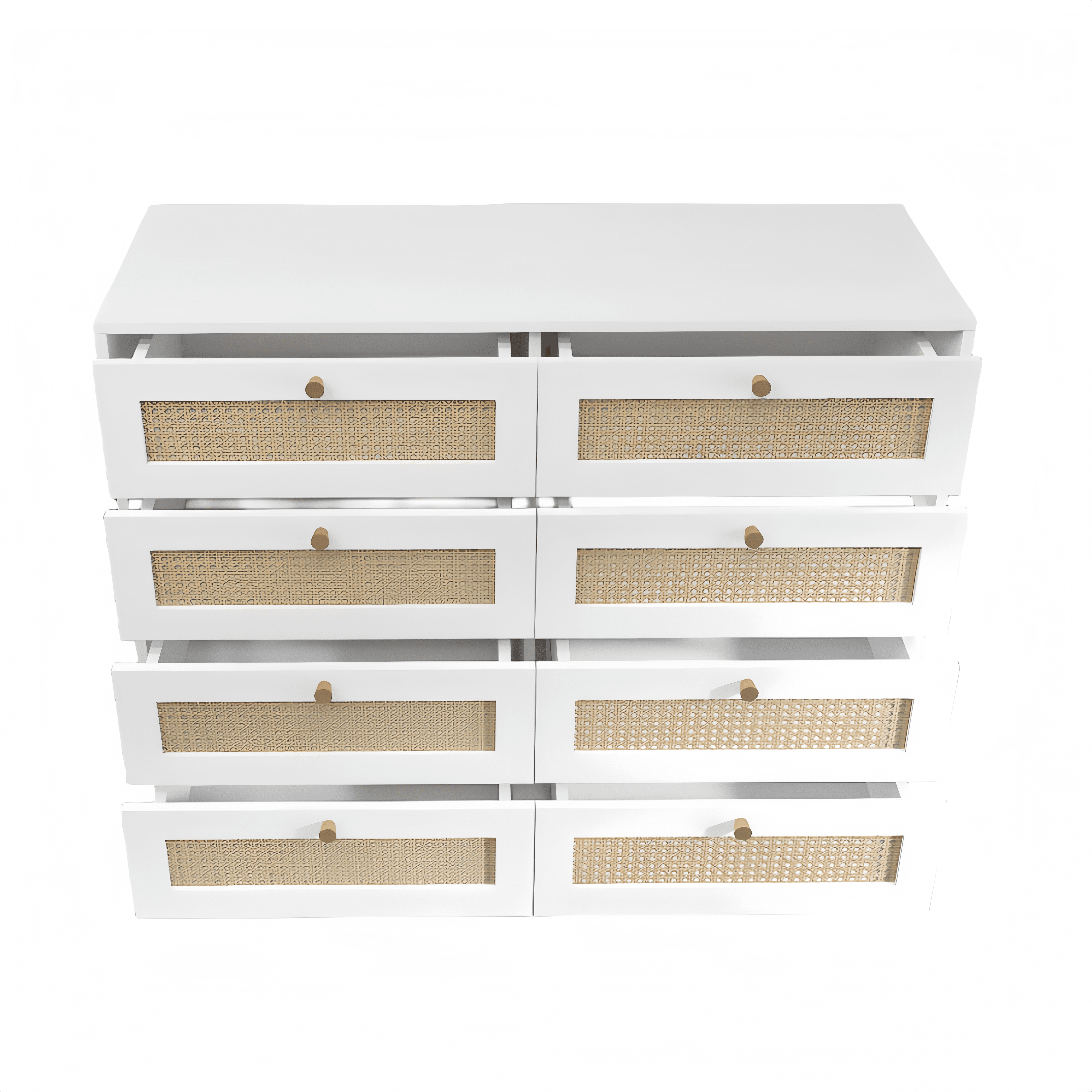 White Color 8 Drawers Chest of Drawers with Rattan Drawer Face Golden Legs and Handles